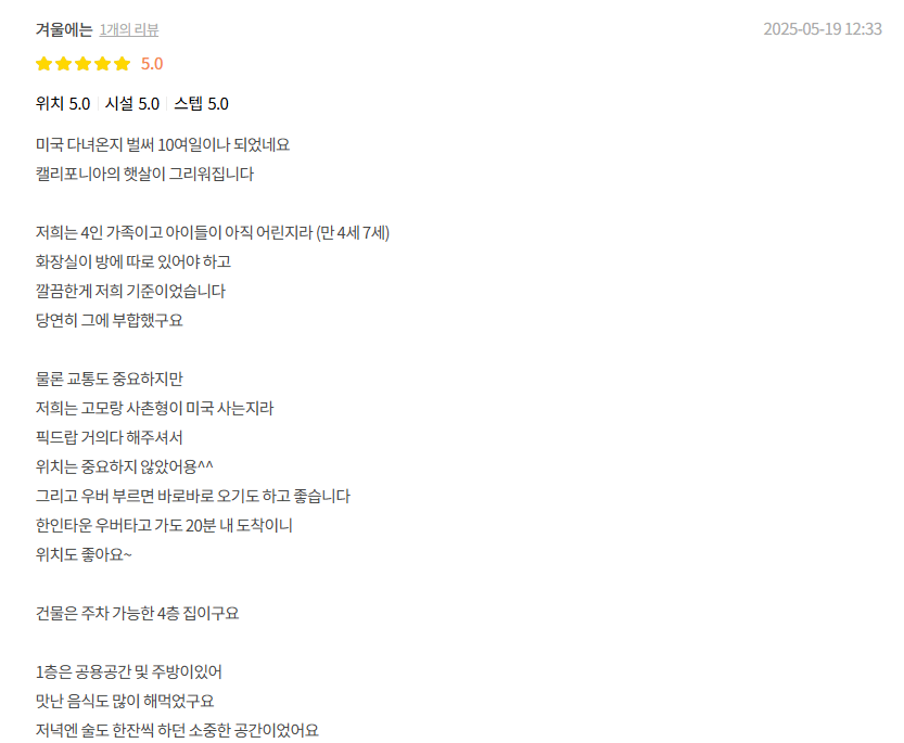 미국에 있는 친척집 놀러가는 느낌으로 편하게 다녀왔다는 리뷰, 선택지가 다섯개 뿐이라 아쉽다는 리뷰까지 확인하고, 예약하세요!