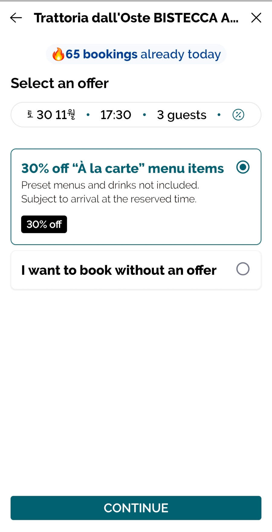 알라카르트 메뉴가 30% 할인인데, 도착하는 시간에 따라 할인율이 달라진다고 해요.17시 30분에 예약하고도 18시에 도착하면 20%만 할인받게 됩니다 =)