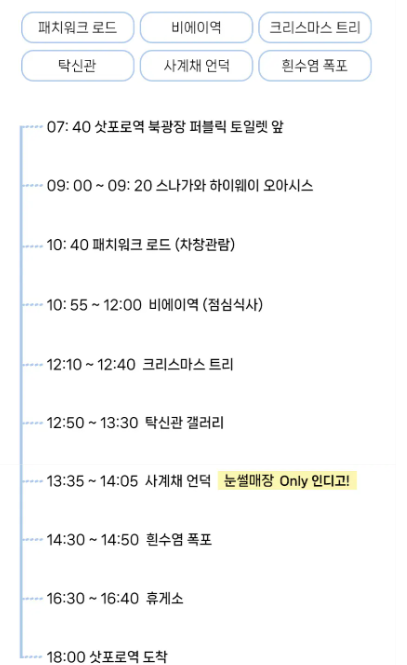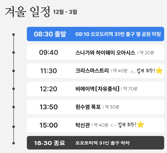 같은 비에이 일일투어라도 업체마다 촬영, 간식, 버스 종류, 자유시간 등 차이가 커요.